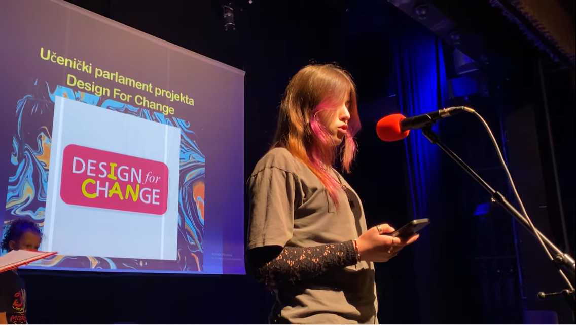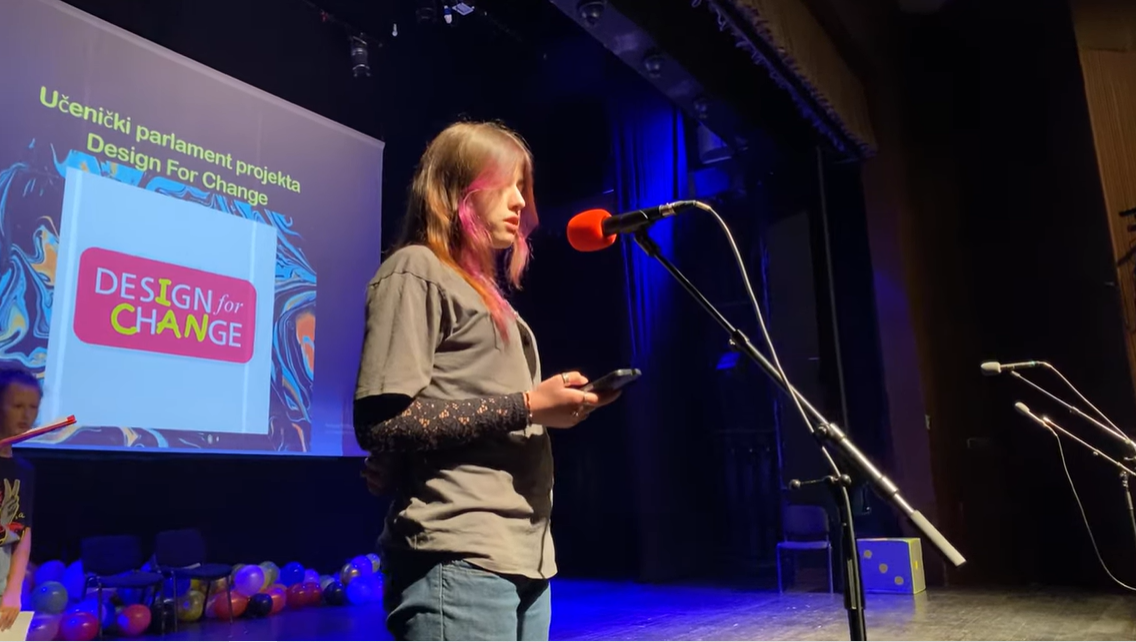 Tokom događaja susreli smo i Mariju Bodrožić, članicu učeničkog parlamenta. Marija nam je objasnila kako savet funkcioniše — koje su uloge učenika i učenica, kako iniciraju teme i kako se odlučuje na čemu će se raditi. Pojasnila je i na koje načine metodologija Design for Change pomaže da ideja prođe kroz faze — od problema, preko rešenja, do realizacije i deljenja. Takođe je podelila iskustvo o tome kako učenici komuniciraju i uče sa vršnjacima iz drugih krajeva i zemalja — najčešće online — i kako im to pomaže da dođu do konkretnijih rešenja zajedničkih izazova. Marija nam je pokazala da možemo zajedno da ulepšamo ne samo svoju školu nego čitav svet.